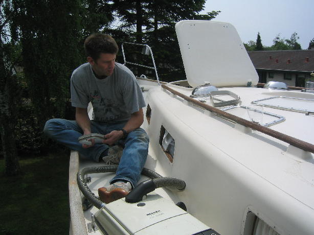 | Første opgave var at få ryddet og rengjort dækket. Bådens logo, en Albatros fugl, ses på fronten af ruffet. Båden hed Albatros da vi købte den og det navn har vi beholdt da vi synes godt om det og håber at se den mægtige oceangående fugl på turen. |