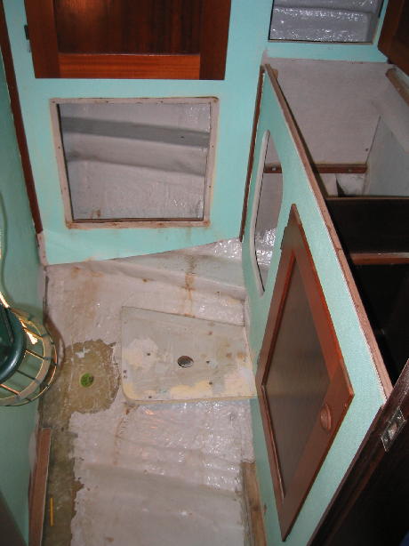 | Salonen som værksted. Dørken er pillet ud og vandtanken ses i midten.Topdækslerne var ikke tætte så de er blevet monteret med ny sikaflex. |
