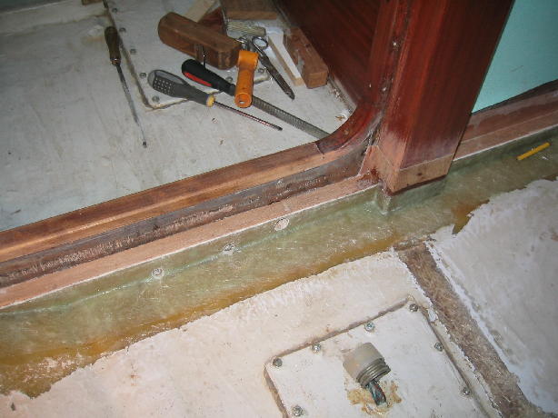 | Bunden af mastefoden og skottet var råddent så her er sat nyt træ i. Der er også støbt ny glasfiber op langs kanten. |