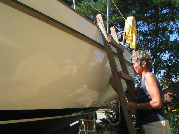 Birthe ved at polere fribordet, bemærk hvordan det skinner.