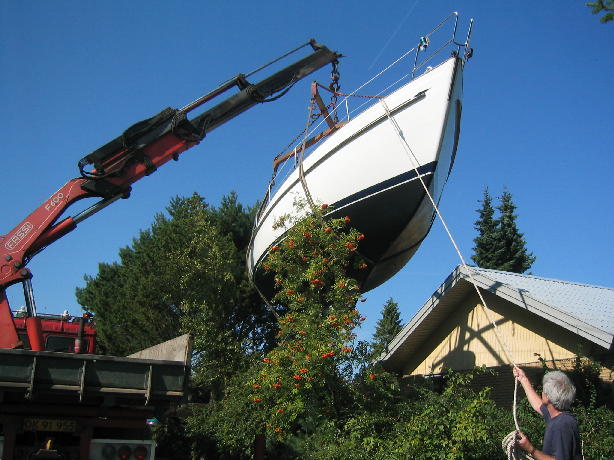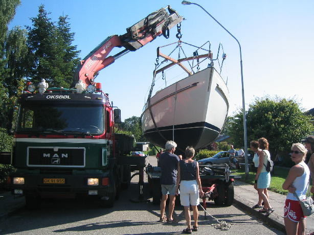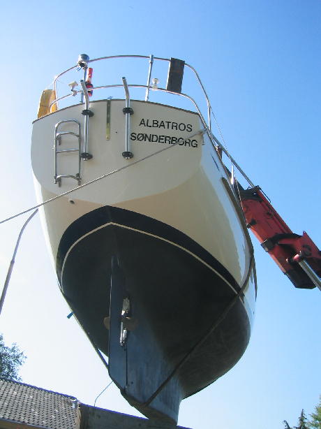 | Nu er den store dag endelig kommet hvor Albatros skal i vandet. Efter 11 uger i haven er båden godt beskidt så vi giver den en grundig vask og polerer fribordet som den sidste ting. Vi er færdige med den sidste ting en halv time før vognmanden kommer. |