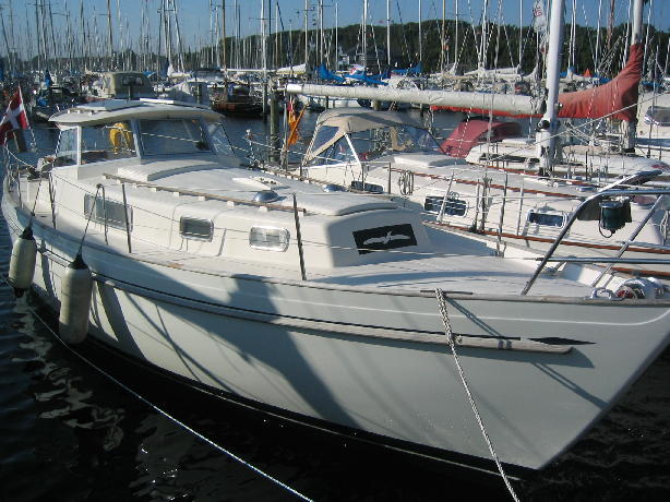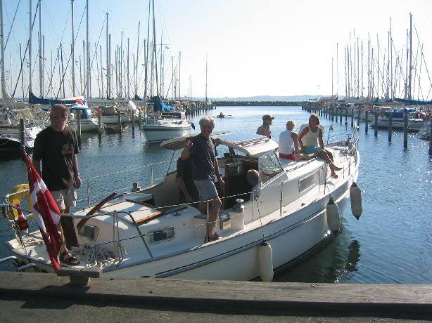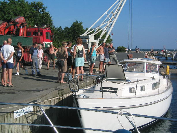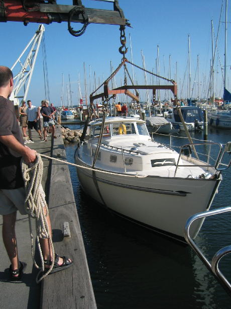 | Veloverstået søsætning. Efter den korte motorsejlads opdagede vi at der kom lidt vand ind ved skrueakslen men det skyldes formentlig at den har stået på land i 2 år så pakningen skal lige "blødes op" igen for at virke optimalt. |