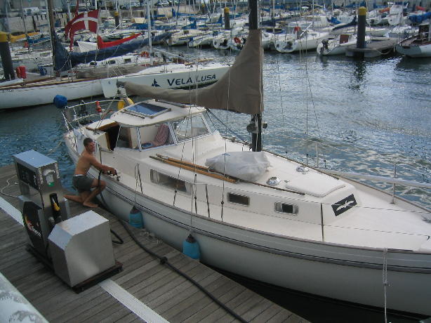 | I Lissabon tankede vi 250L tanken helt op med diesel. Vejrudsigten havde nemlig lovet svag vind, og når det for sejl går under 3 knob starter vi motoren som giver en marchfart på 6 knob. Ved denne hastighed, som er mest økonomisk, bruger vores Volvo Penta 50HK 3 liter i timen. |