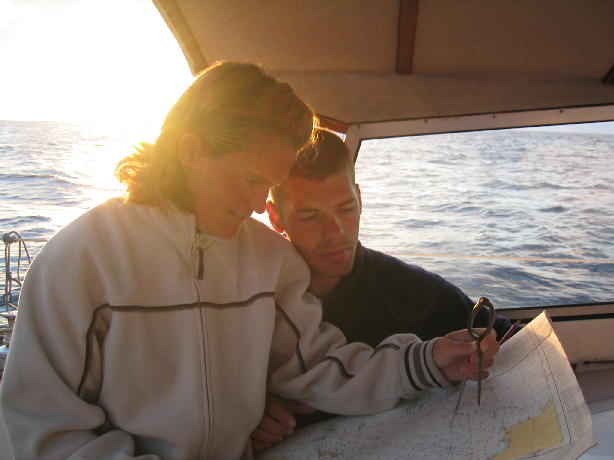 | En håndfuld gange om dagen sætter vi vores position ind på søkortet. Det foregår ved at aflæse længde- og breddegrader på vores GPS-instrument, hvorefter vi vha. en passer kan slå to streger, som giver et kryds hvor vi er. |