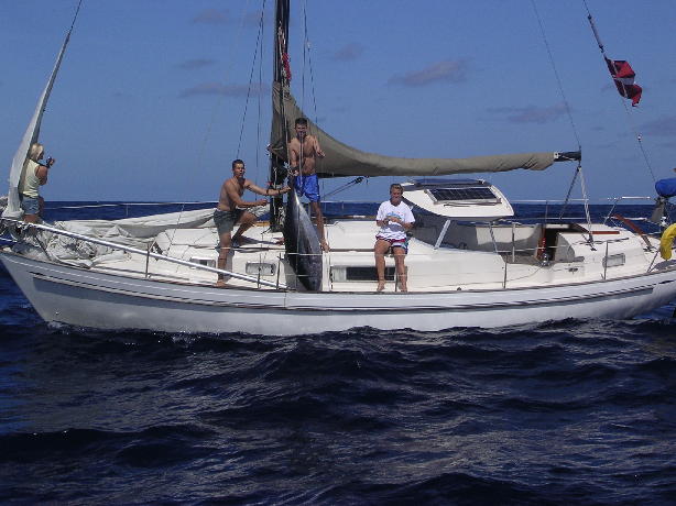 | Kort efter vi fangede 200kg tunen, kom 2 svenske langturssejlere forbi og fik et stort stykke kød. I stævnen står Kathrine og filmer og Camilla tager billeder, mens drengene har besvær nok med at håndtere fisken. |
