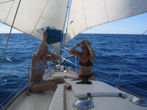 | Sådan foregår badet når vi er til havs i flere dage. Havvandet er varmt og klart, så bortset fra. at shampooen ikke skummer så godt i saltvand (eller måske pga. vores fedtede hår), er det en udmærket måde at tage bad på, når bare man kan skylle sig med lidt ferskvand bagefter. |