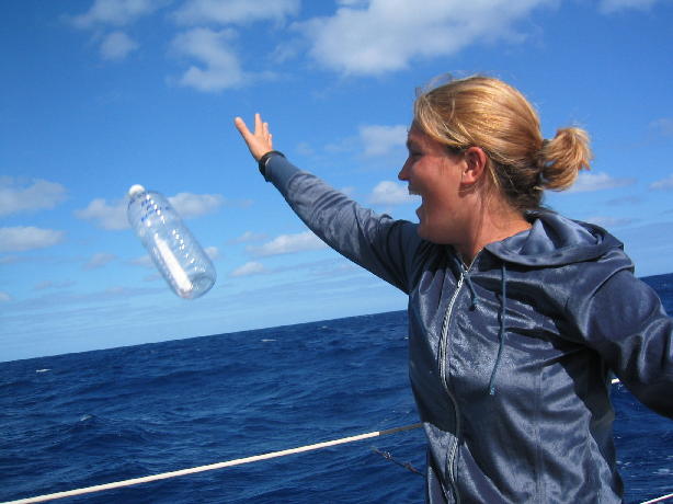 | Camilla sender her en flaskepost afsted med et brev på engelsk om turen og hendes email adr., i en af vores utallige tomme 1½ liters vandflasker. Det bliver spændende om hun hører noget når den engang driver i land, men hvis den bliver fundet på Afrikas kyst, har vedkommende der finder den, næppe adgang til email. Alle andre tomme vandflasker, samt andet affald, opmagasinerer vi i ankerbrønden, til vi kommer i havn. |
