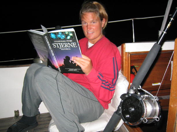 | Vi ser en del stjerneskud herude på havet og Camilla har lige fundet ud af, at det vi normalt kalder stjerneskud slet ikke er stjerner, men små partikler, som flyver ind i atmosfæren fra rummet. Den store fiskestang er også ude om aftenen. |
