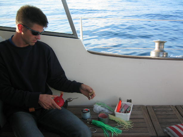 | Henrik ordner fiskegrejet. Når vi sejler under 5 knob bruger vi woblere, som dykker et par meter ned og når det går over 5 knob bruger vi div. plasticblæksprutter på 10-30 cm, som hopper i overfladen. Den grønne og gule blæksprutte købte vi efter stort besvær i Lissabon, da de ikke findes i Danmark. De er endda selvlysende, så fiskene kan se dem om natten. |
