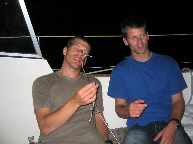 | Vi overvejede længe, hvordan vi skulle få den indenbords. Det endte med, at Henrik sprang i vandet og bandt et reb om halen på den, så vi kunne hive den op i masten vha. spillet. Det var hårdere end at hive sejl op. |