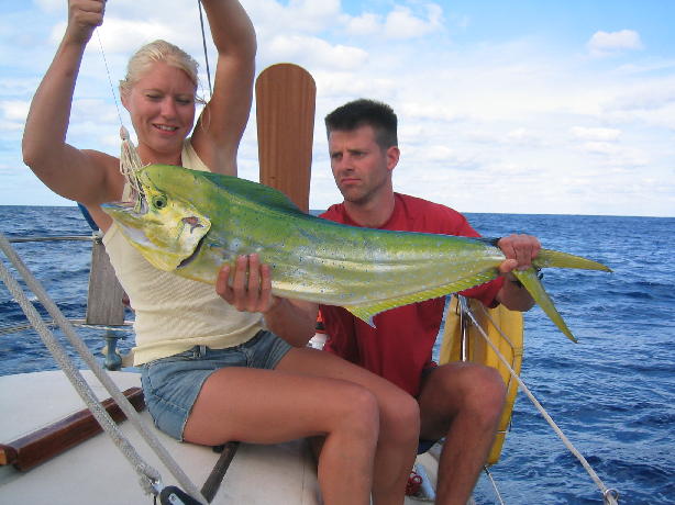 | Her har Kathrine fanget en guldmakrel, der er kendt for at miste deres flotte farver når de dør, men denne kom levende ud igen, da vi havde fanget en anden guldmakrel kort forinden, som skulle spises først. |