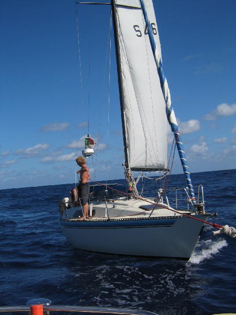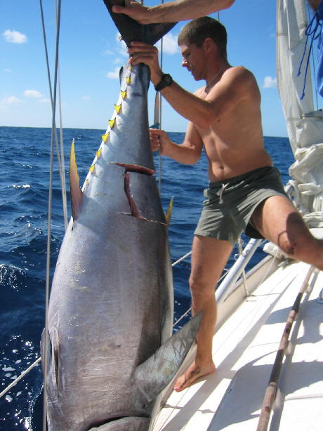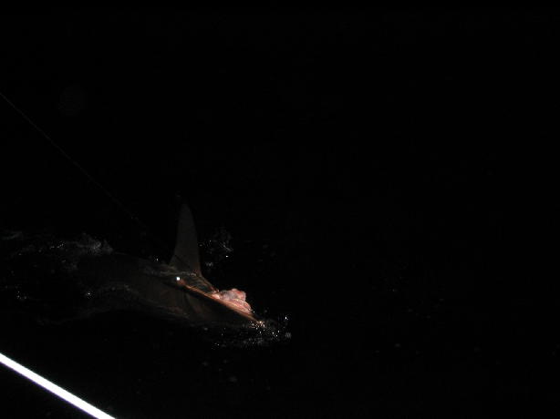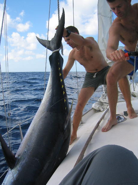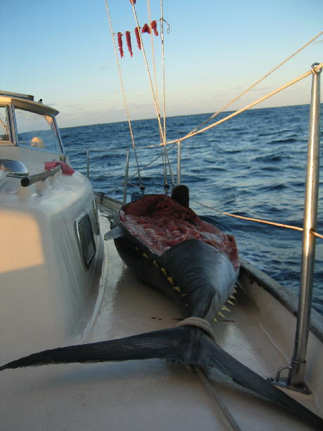 | Her kommer den svenske båd ”Marinara” forbi. Vi hejste en ca. 30.kg’s ”tunsteak” ud bag båden i en snor, som de, også med besvær, fik op i båden. |