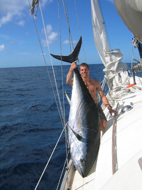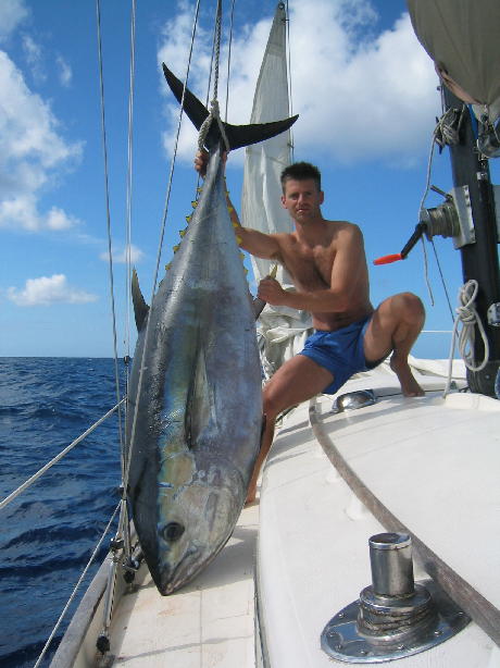 | Det stykke var cirka hvad vi kunne spise, men heldigvis kom 3 andre både forbi og fik del af tunen. Pudsigt at møde 3 andre skandinaviske både langt ude på Atlanten. |