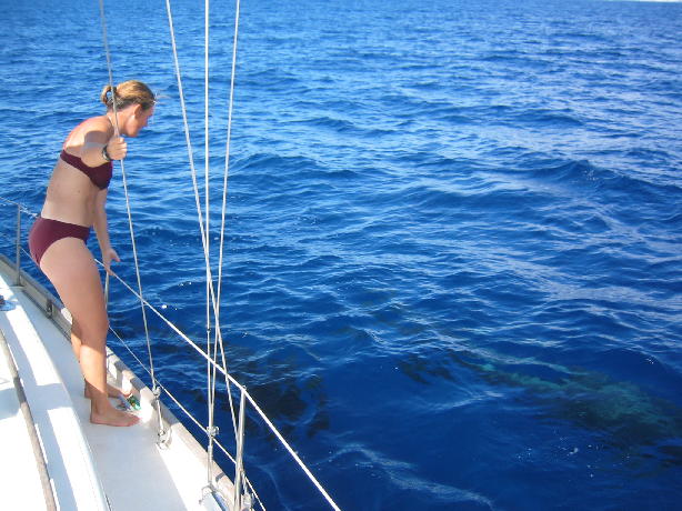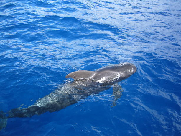 | Mellem øerne Tenerife og La Gomera holder der en bestand på 300-400 grindehvaler til. De lever af at fange blæksprutter om natten, så om dagen ligger de, i flokke på mellem 5-10 individer, og sover i overfladen. Så en dag besluttede vi os for at tage på ”hvalsafari”. Vi havde fået at vide at de holdt til ca. 2-3 sm fra kysten, og efter en halv times sejlads var de der. |