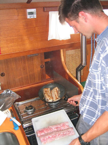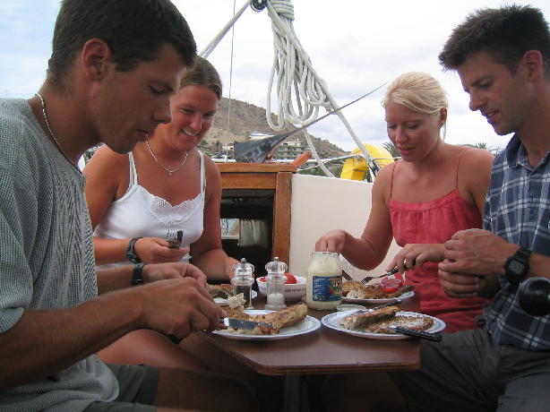 | Her nydes sværdfisken til frokost med rugbrød, som vi havde købt ved en dansk bager hernede – mums. Den smagte til forveksling som et godt stykke kylling og rugbrød er jo heller ikke til at tage fejl af når man ikke har fået det i lang tid. Bemærk lige sværdfiskehovedet i baggrunden. |