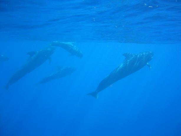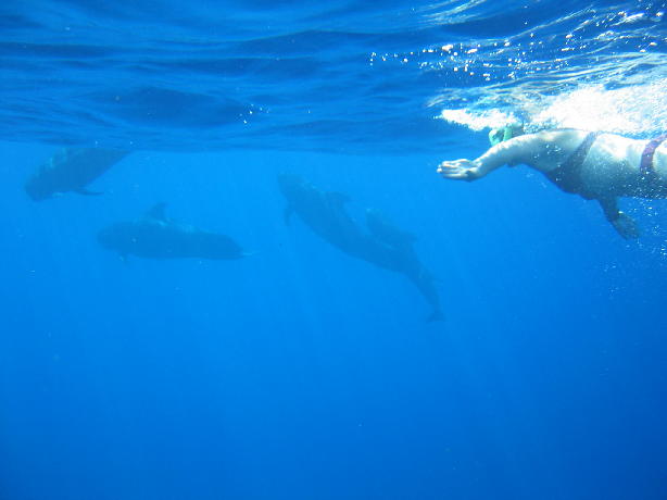 | De svømmede fredeligt rundt i overfladen, så vi tøvede ikke med at hoppe i vandet til dem. De virkede jo ”små” i forhold til blåhvalen vi havde snorklet med tidligere på turen. Grindehvaler kan blive mellem 3-6 meter lange. Her svømmer Camilla efter flokken. |