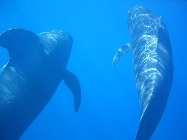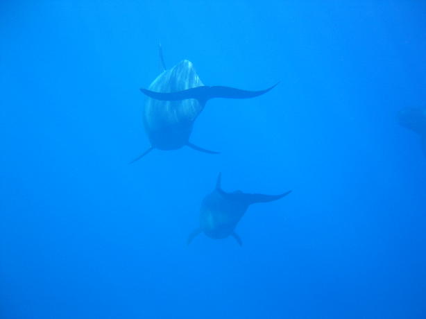 | I denne flok var der en babyhval på ”kun” 2 meter som bliver skarp forfulgt af moderen. Det er helt fantastisk at snorkle på de store dybe oceaner da sigtbarheden er så enorm god. Man kan følge hvaler langt væk gennem dykkermasken og hvis man kigger langt ned i dybet føles det som om man svæver højt oppe. |