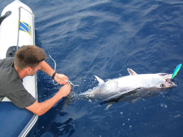 | Da vi en dag sejler fra Tenerife til Gran Canaria er der noget der snupper vores agn. Båden bliver stoppet op og så er det ellers bare at hive line ind på fiskestangen. Da fisken kommer til overfladen har vi igen problemet med hvordan vi får den op på båden, og det ender med Henrik må ned i gummibåden, som vi havde på slæb, og binde en snor i halen. Det var ikke helt nemt, for tunen var så fuld af energi, at den blev ved med at piske med halen, så han blev helt våd. |