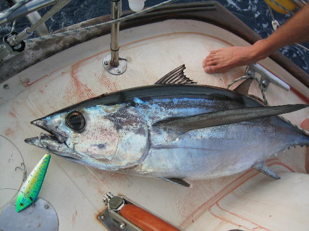 | Det er altid spændende at se hvad der kommer op af dybet. Denne gang var det en langfinnet tun på 25 kg. Her ses tydeligt den lange brystfinne som er karakteriserende for netop denne art. Tunen har her bidt på en slags wobler, som imiterer en lille guldmakrel i farve og form. |
