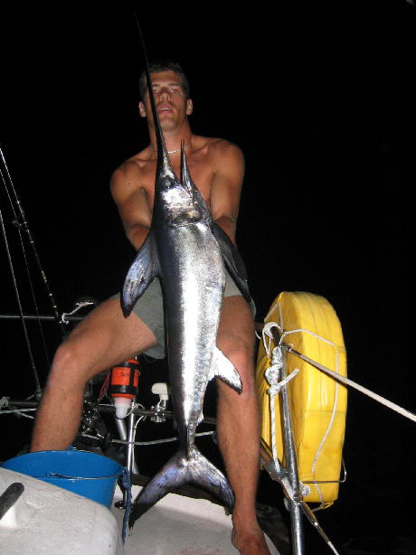 | Om aftenen er der bid igen. Denne gang en mere sjælden sag, nemlig en ægte sværdfisk. Man kan kun fange sværdfisk om natten, hvor de jager og vha. at fægte med deres sværd, først lammer og dernæst spiser de byttet. |