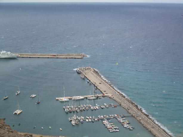 | Her ligger Albatros blæst inde i havnen med de 6 andre skandinaviske både. På turen fra DK til Gran Canaria lå vi hovedsagelig ”kun” blæst inde 3 steder, i en lille uges tid, uden at kunne sejle. Det var på Helgoland, Falmouth og her på Porto Santo. En af de få fordele ved at blæse inde er, at man får tid til at gøre ting man ellers ikke vil gøre, som f.eks. at gå op på et bjerg og tage et billede ned på båden. |