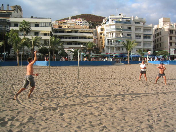 | På stranden i Los Christianos spillede vi en del beachvolley. I baggrunden ses den hyggelige strand promenade samt små hoteller. |