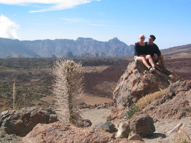 | På Tenerife lejede vi også en bil for at køre øen rundt. Temperaturen falder en ½ grad pr. 100 højde meter, så da vi kørte fra havoverfladen og op i 2500 meters højde, faldt temperaturen til 10 grader. Her ses nogle lavamarker fra vulkanen El Teide. |