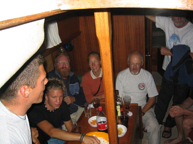 | Hyggelig aften med chips, rom og cola. Jakob fortæller og viser billeder/video af kæmpe tun og hammerhaj. Vi var i alt 13 ombord på Albatros den aften, så der var meget snak og varmt ombord. Da Henrik, Jakob og Camilla var af sted i Pale Rider på 26 fod, var det altid dem der blev inviteret over på de større både. |