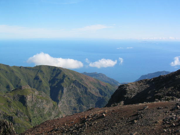 | Her er udsigten fra det højeste punkt (1818m) på Madeira. Den lille øgruppe der svagt kan skimtes til højre i horisonten er Porto Santo, der ligger ca. 8 timers sejlads herfra. |