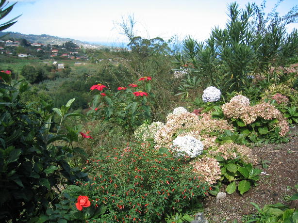 | Madeira er en utrolig frodig ø, hvilket skyldes at den er tilstrækkelig høj til at ”fange” skyerne som indeholder regn. I vejkanten groede der hortensia overalt i alskens farver, her er også en rose samt nogle julestjerner i baggrunden. |