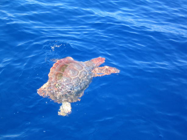 | På vej fra Madeira til Tenerife så vi en del havskildpadder. Denne her er så tæt på båden så den må vige for os. Her er flere tusinde meter dybt, så havskildpadderne lever her helt pelagisk, hvilket vil sige uden kontakt til havbunden eller kysten, og spiser omkringdrivende gopler og tang. |
