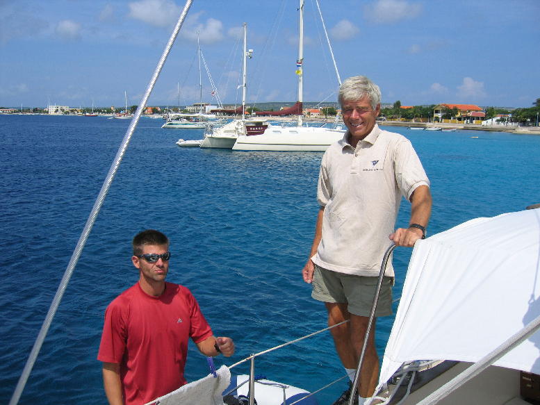 | Mogens på vej ned i gummibåden for sidste gang i denne omgang. Han påmønstre igen i Stillehavet. Ved ankerbøjerne på Bonaire ligger man hvor bunden skråner fra lavt vand til meget dybt vand. Hver dag svømmede dykkere rundt på bunden mellem sejlbådene. |