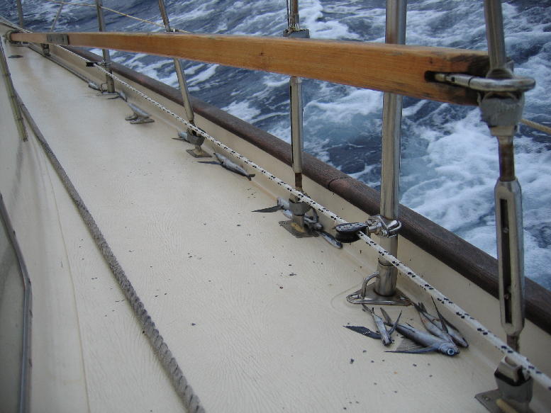 Efter en mørk og blæsende nat lå der 42 flyvefisk på dækket.