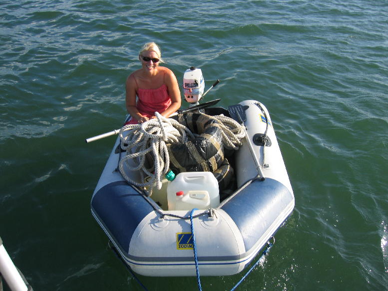 | Gummibåden var godt læsset da vi skulle have de 4 liner og 6 bildæk sejlet ud til båden. Endnu værre var det da vi skulle have de 4 indkøbsvogne fulde af proviant ombord, vi måtte sejle 4 gange. |