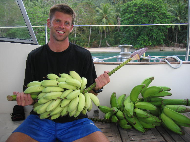 | Smilet stivnede da en stor kakerlak løb ud af bananstokken og ned under teakdørken i cockpittet. Vi havde hørt om andre sejleres problemer med at slippe af med disse dyr. Smilet kom dog på plads igen, da Henrik smadrede den med en velplaceret knytnæve. |