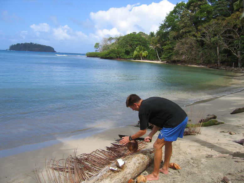 | Det dejlige sted Punta Sabanilla (Playa Blanca), hvor vi med macheten fik øvet os i at åbne kokosnødder. På et tidspunkt kom 3 fiskere gående forbi, og selvom vi synes vi var rimelig gode til at åbne nødderne, må vi have set noget kluntede ud, for de tilbød at vise os hvordan det skulle gøres, og de tog da heller ikke den halve tid om det. Den yngste af fiskerne klatrede op i en ca. 10 m. høj palme og hentede umodne kokosnødder ned til os alle, indeni var der væske, klar til at drikke. |