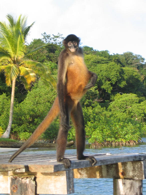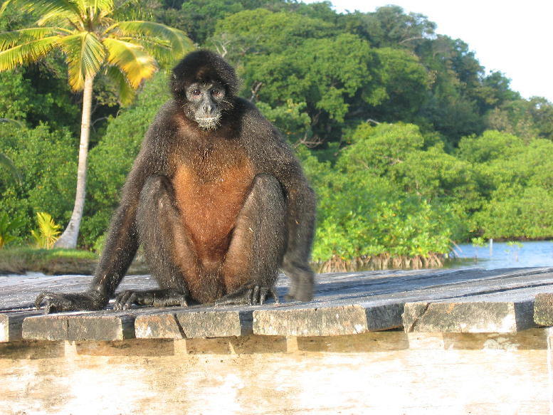 | Efter at have holdt godt øje med bredden, fik vi øje på nogle små uldne krabater i palmetoppene og på stranden. Vi skyndte os i gummibåden, med bananer og æbler i tasken. |