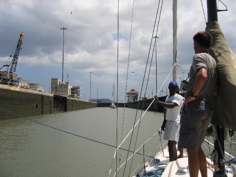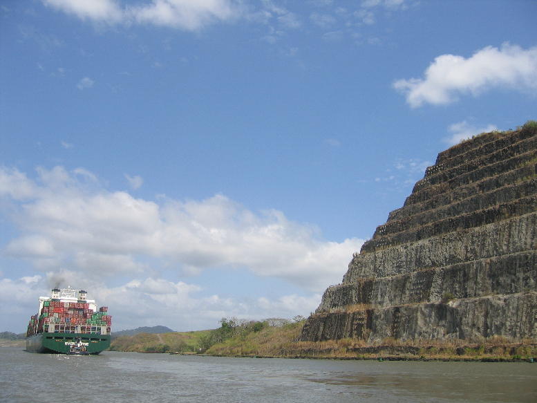 | Her sejler vi forbi Gold Hill, det højeste punkt langs kanalen. Under konstruktionen af kanalen sprængte man sig gennem denne klippe. Amerikanerne overtog konstruktionen af kanalen i 1903, efter franskmændenes mislykkede forsøg. Arbejdet tog ti år, arbejdskraften fra 75.000 mand og et budget på ca. 400 mio. US Dollars. Siden kanalen åbnede har ca. 850.000 både taget turen gennem kanalen. I 1999 overgav amerikanerne kanalen til Panama. Lodsen og lineholderne kunne fortælle, at administrationen af kanalen aldrig har fungeret bedre, men at de alligevel var utrolig kede af amerikanernes tilbagetrækning. Da Panama efter 1999 selv skulle til at udbetale lønnen, faldt en havnearbejders løn fra 5 US dollars til 90 cent i timen. |